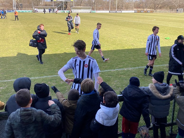 (1. seniorspilleren, Oliver Ritter, hilser på de unge B1903-fans. Dagen efter kom Oliver og trænede dem på campen)