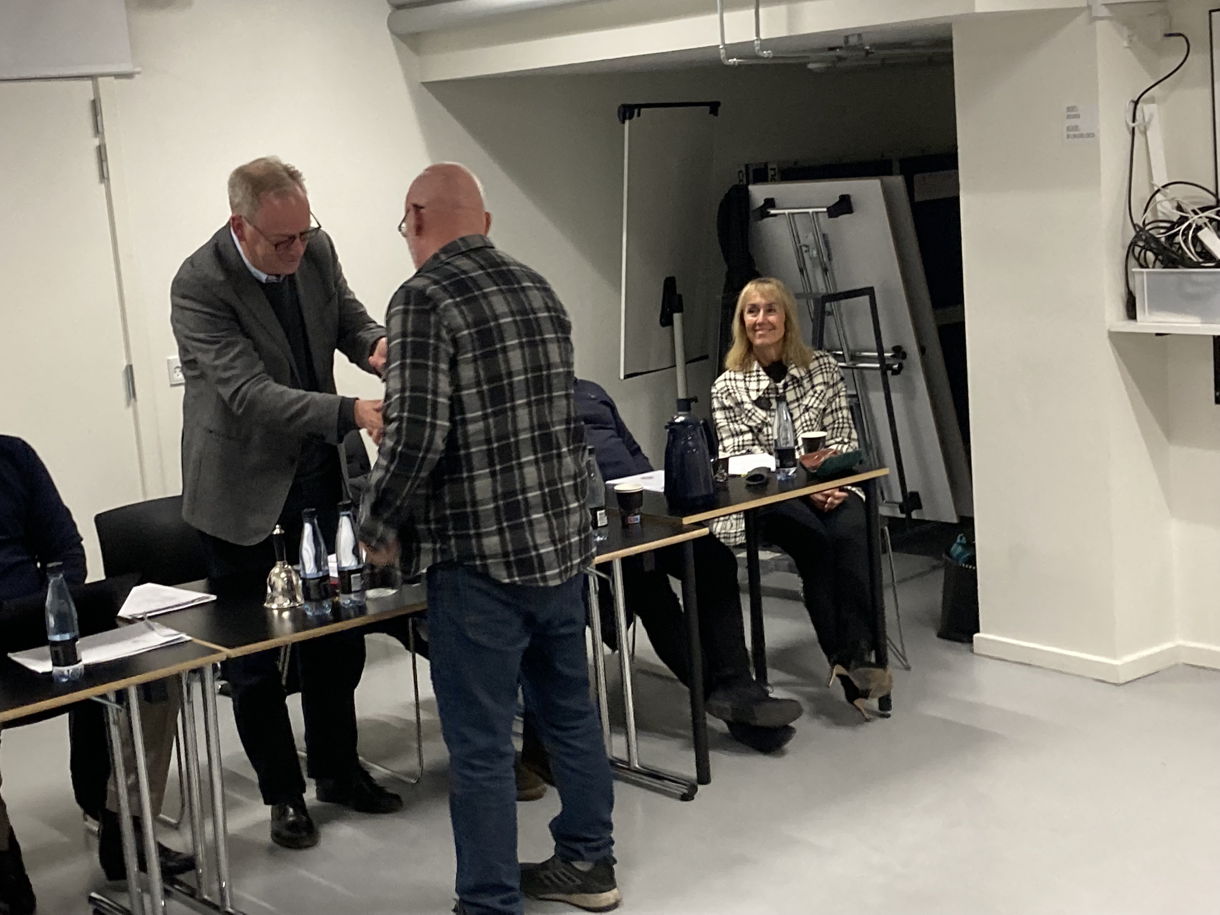 Formand Benny Olsen overrækker jubilæumsnål til Sten Johansen