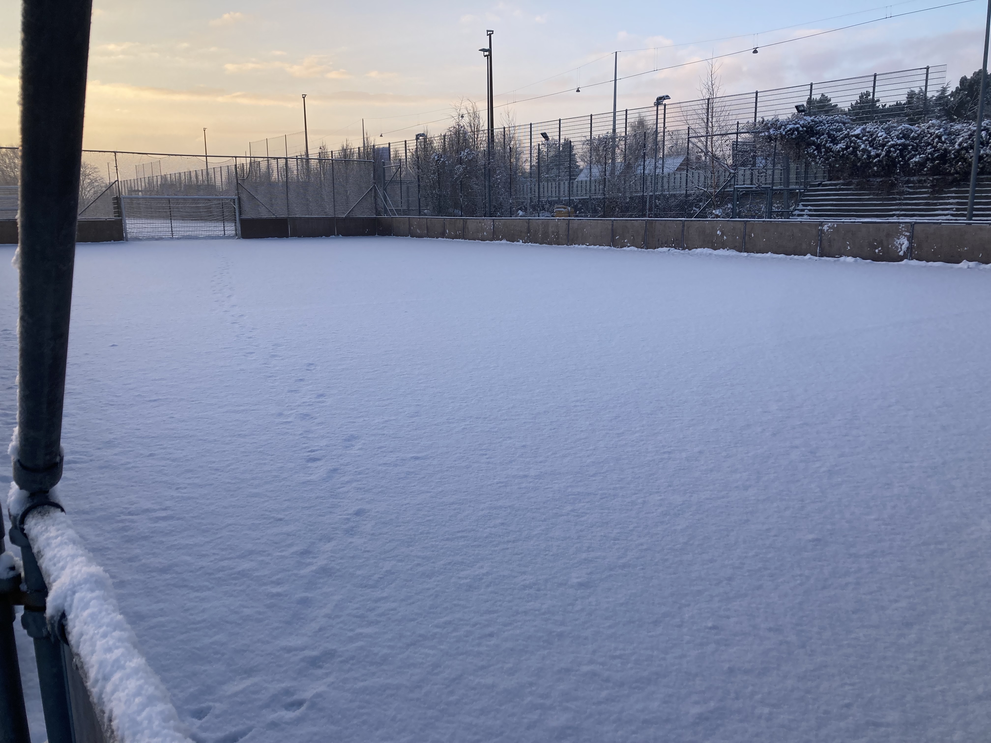 De voksenhold som har tid i aften kan ikke forvente, at sneen bliver ryddet. Og selvom sneen bliver ryddet, så er anbefaling fra B1903 også, at man er opmærksom på, at banen kan være hård og glat, da kork baner ikke er lige så modstandsdygtig overfor flere dage med frost som de gamle gummi-granulatbaner.