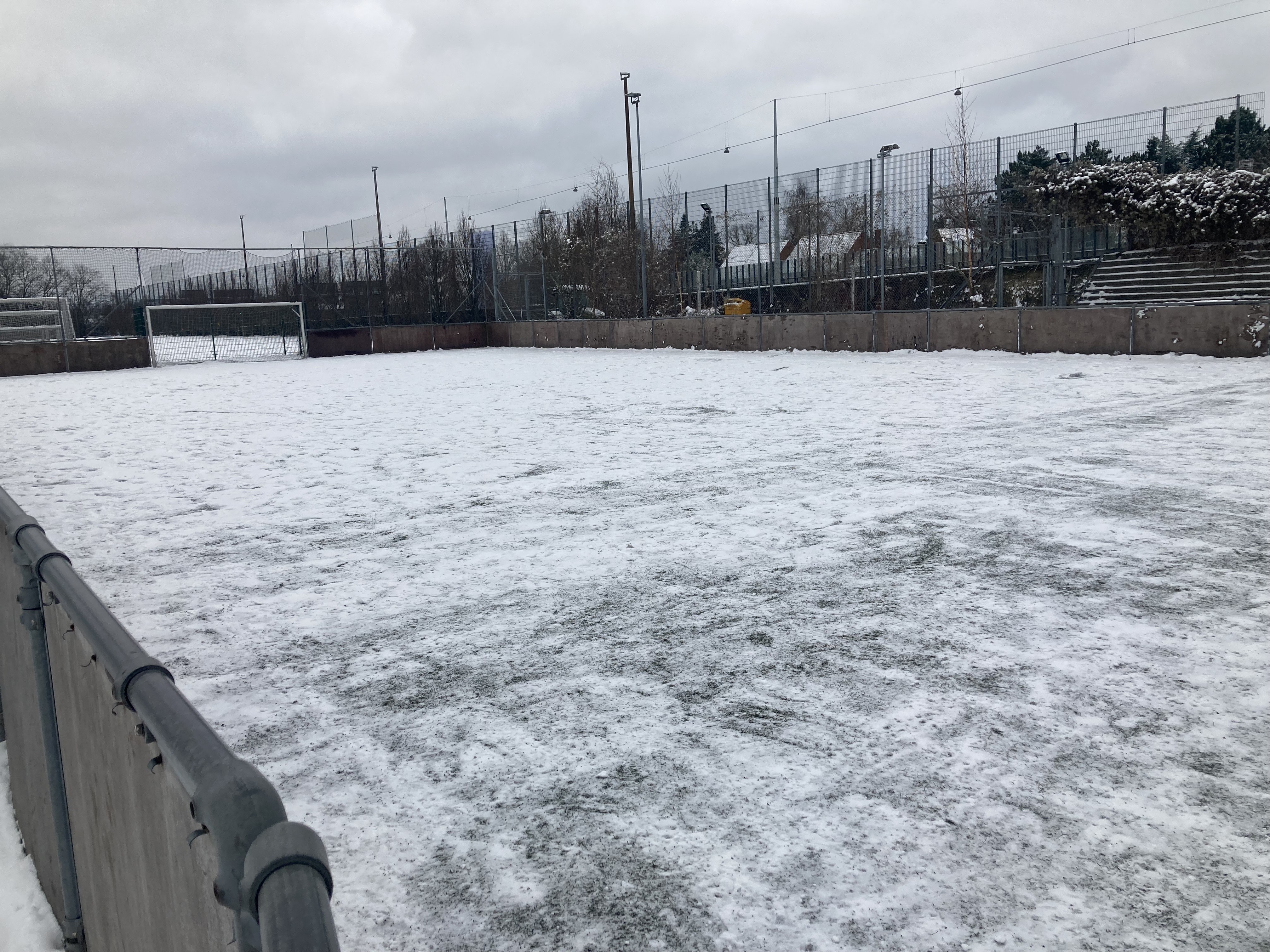 Bandebanen i B1903 har et tyndt lag sne, og enkelte steder lidt sneklumper, se billede. Med vejrudsigten i dag forventes det, at det lag bliver endnu mindre, og at der godt kan trænes. Dog skal træningen nok indrettes lidt efter forholdene. Det er ikke til decideret teknisk træning, men savner med højt humør og få rørt sig, så kan man godt lave lidt kamp på banen.