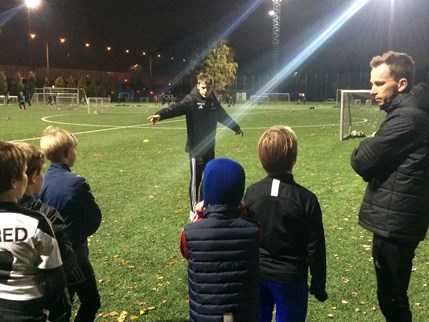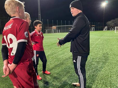 (Frederik evaluerer efter en øvelse med tre U13-spillere)