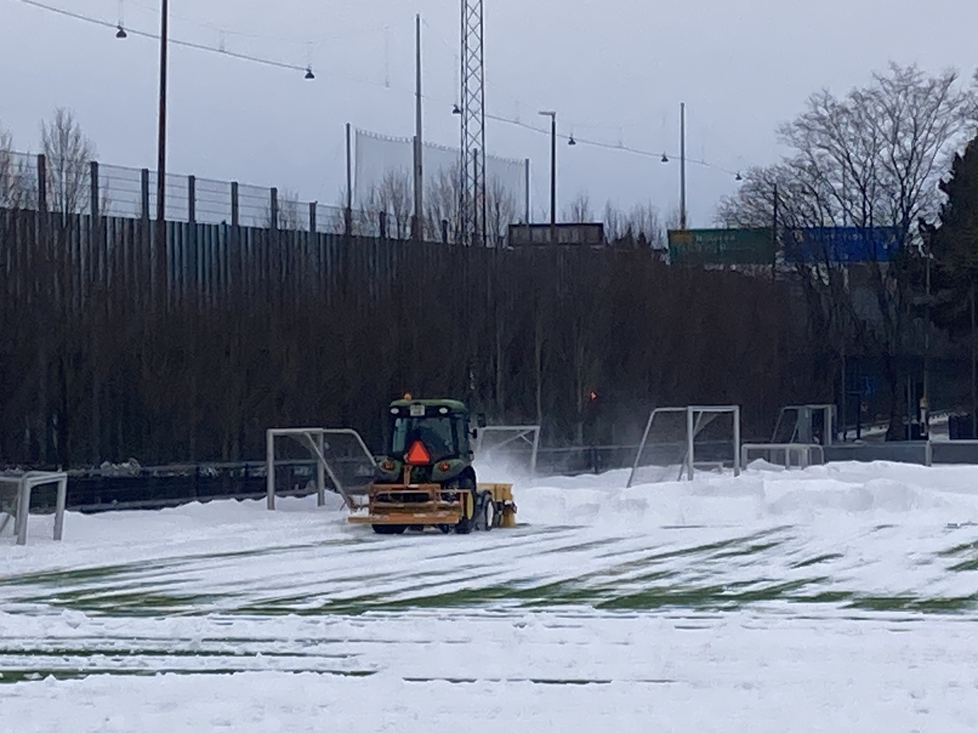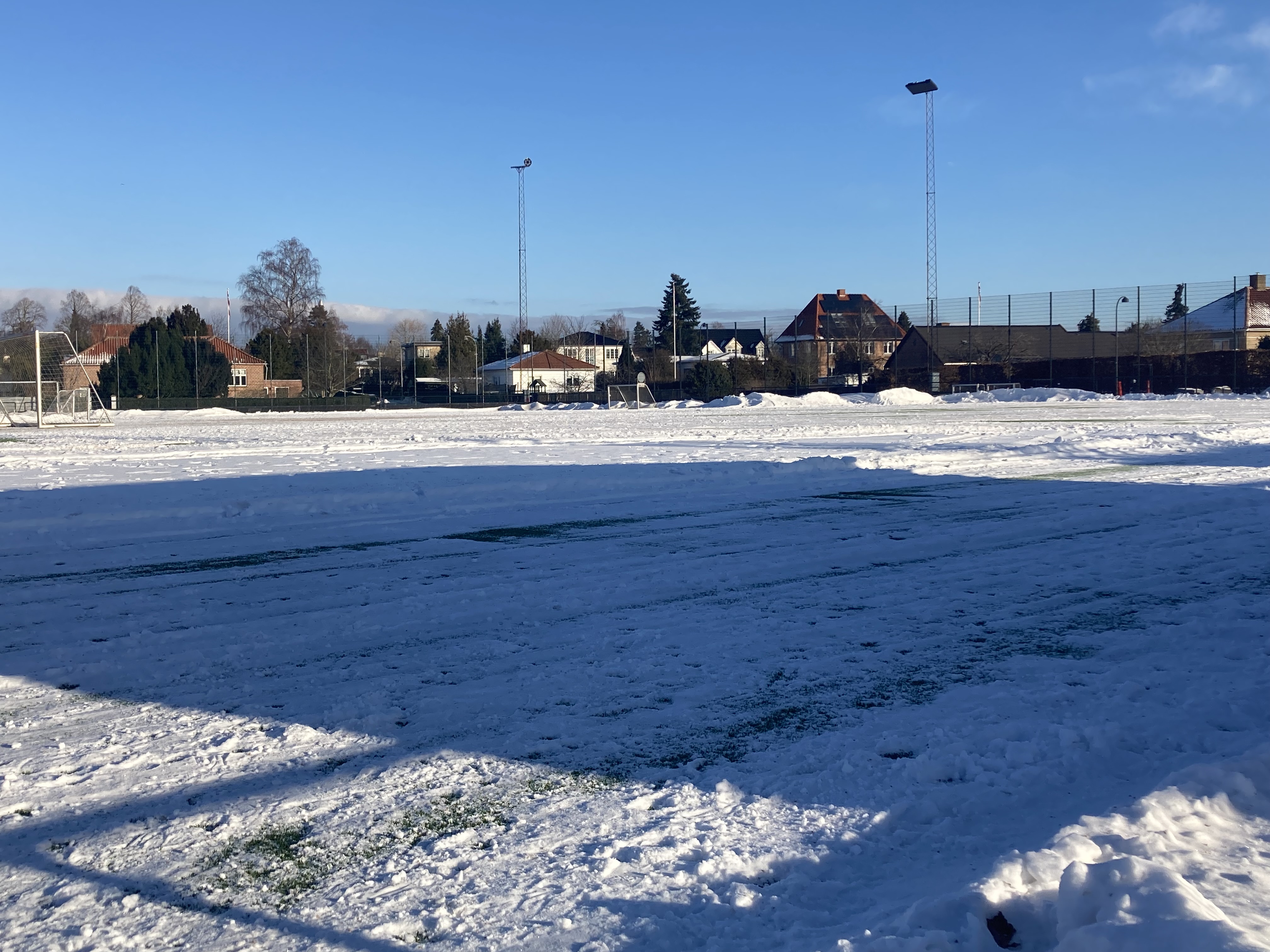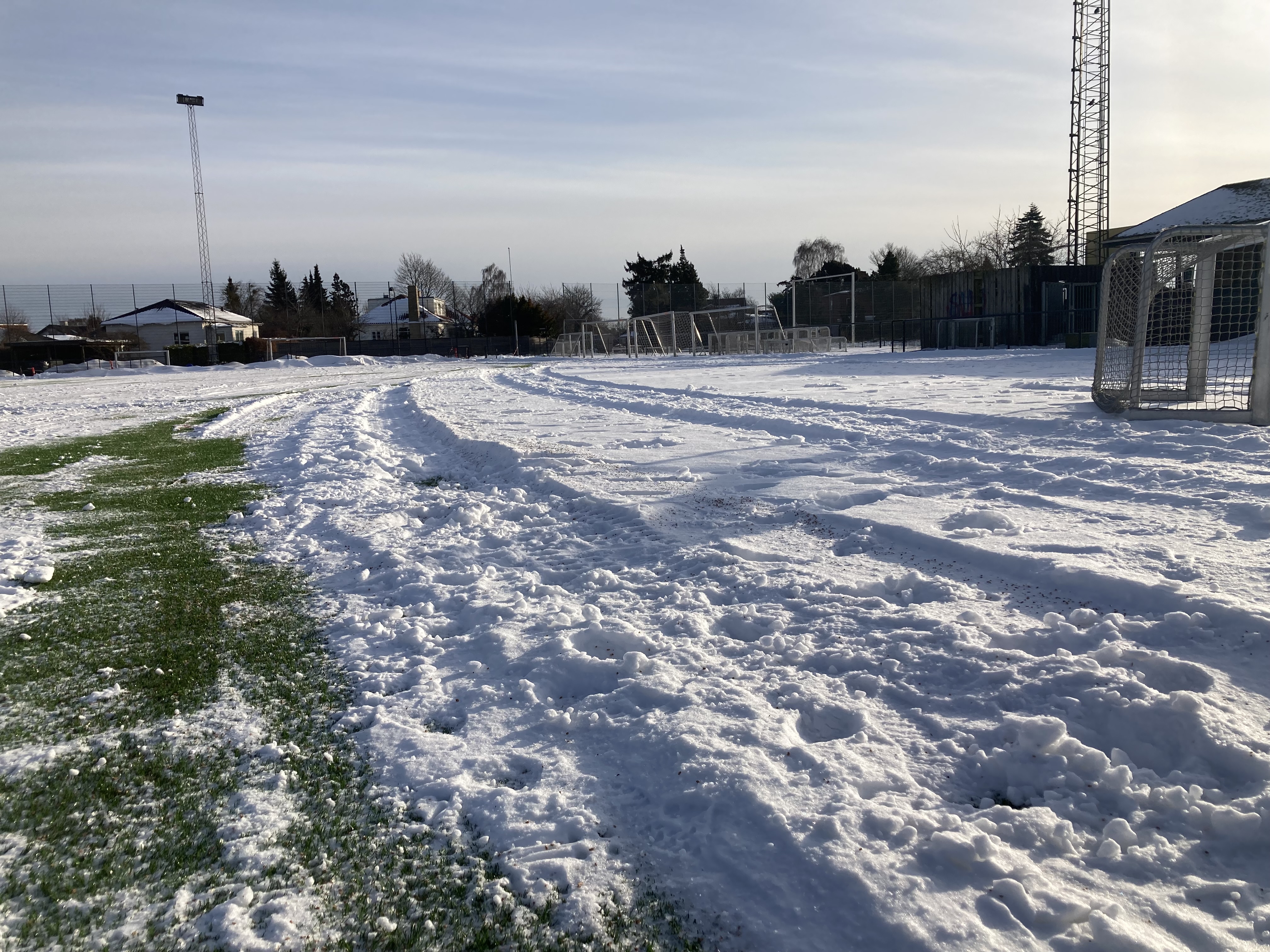 Snerydderne har været her henover frokost og fjerne snebunkerne i feltet og langs sidelinjen. Super godt, så nu kan der trænes på hele banen.