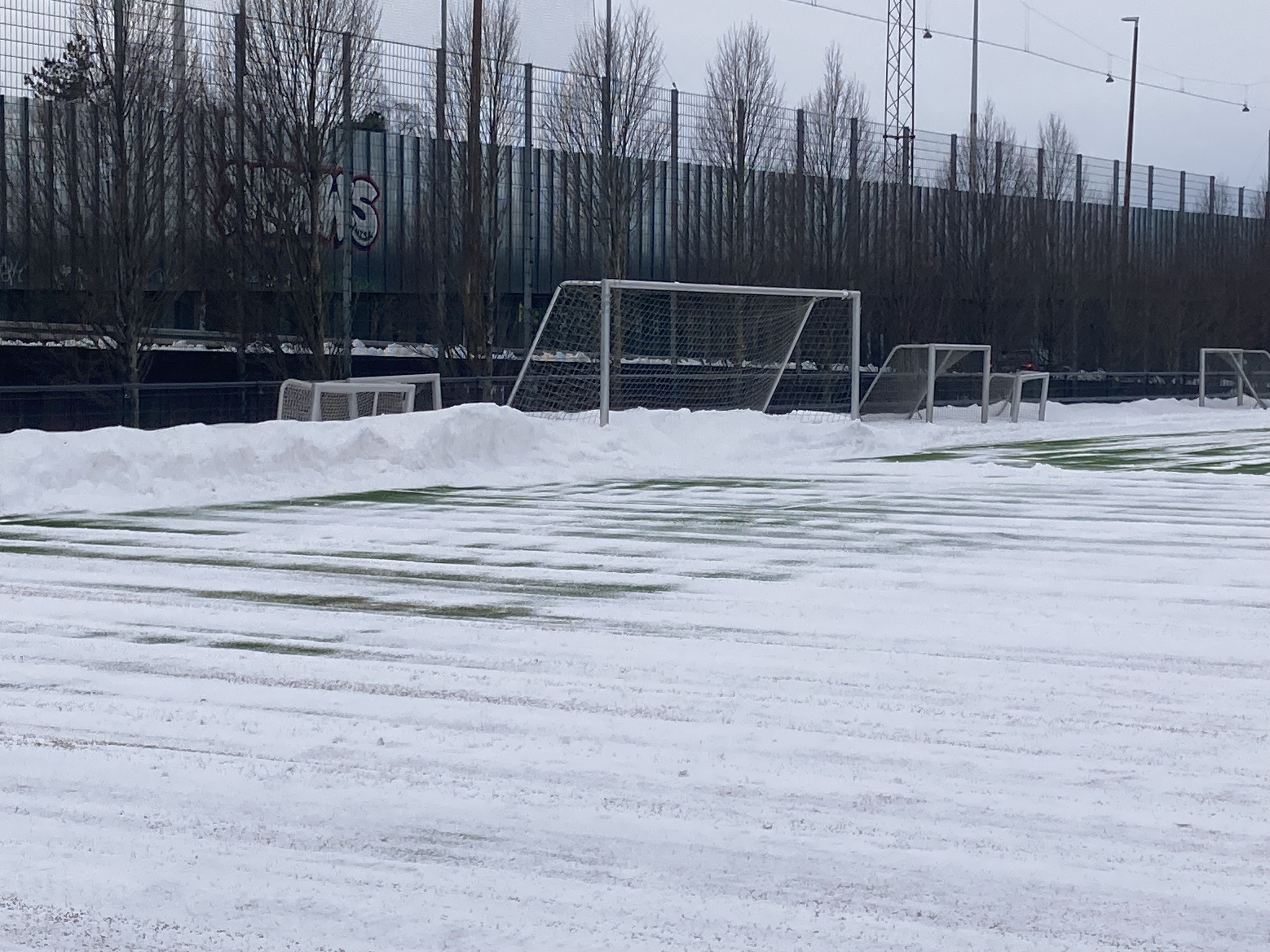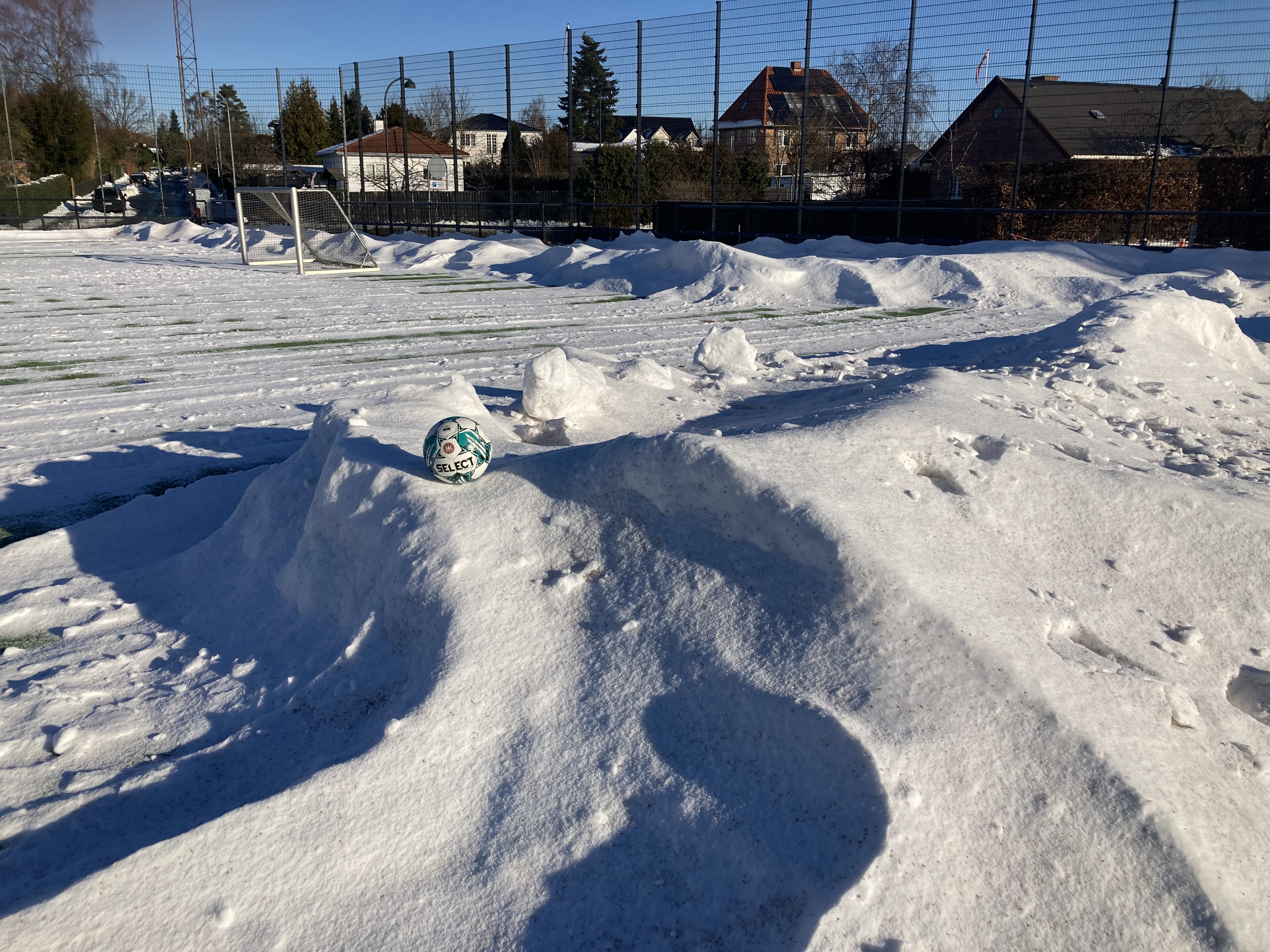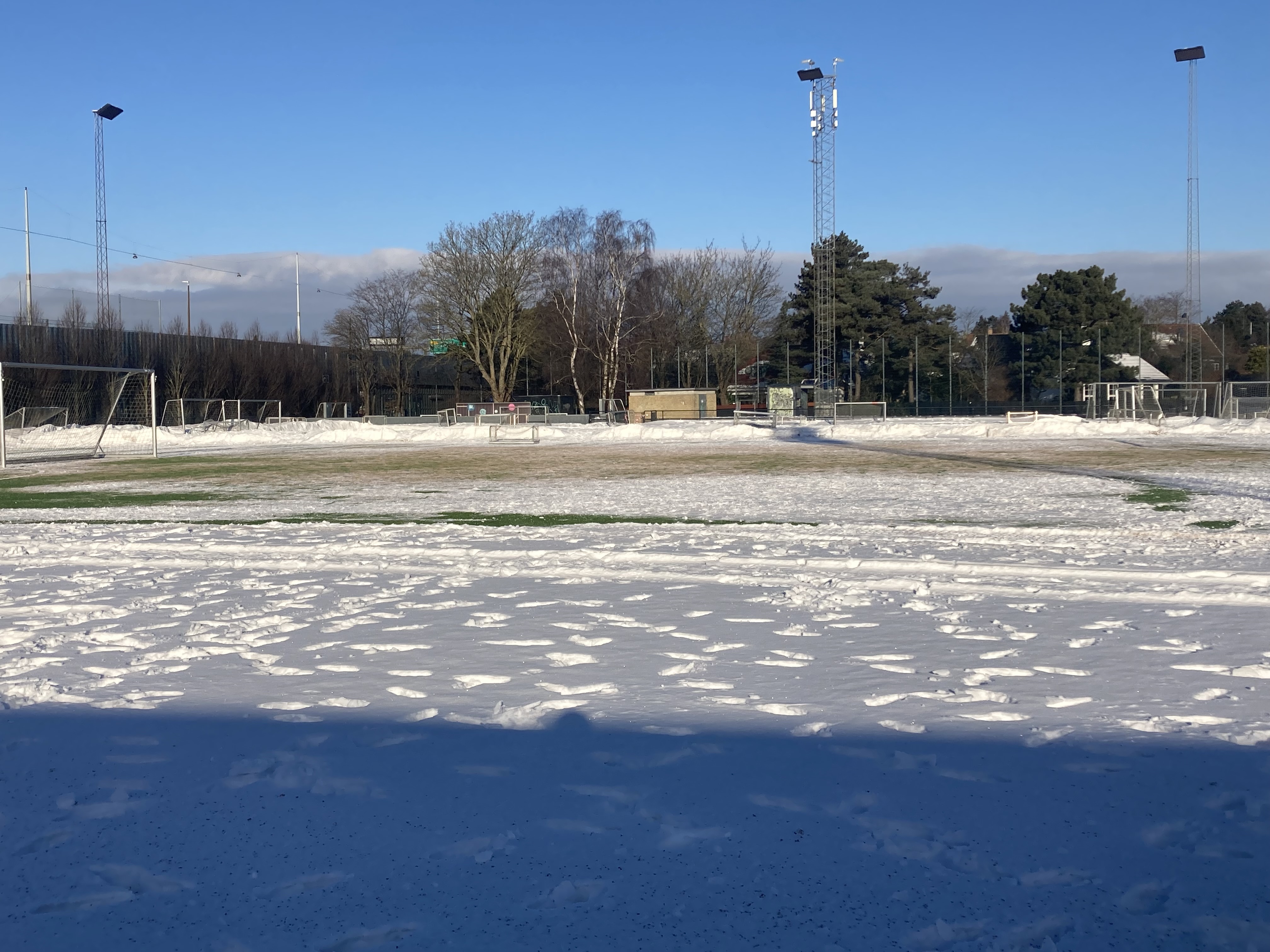 Snerydderne har været her henover frokost og fjerne snebunkerne i feltet og langs sidelinjen. Super godt, så nu kan der trænes på hele banen.