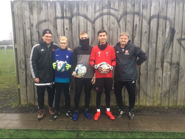 (Palle Plankeværk med sine tre nye målmænd og flankeret yderst til venstre af Palles tidligere træner, Keld Kristensen, som med sin kontakt til Palle har fået ham tilbage i folden i B1903)