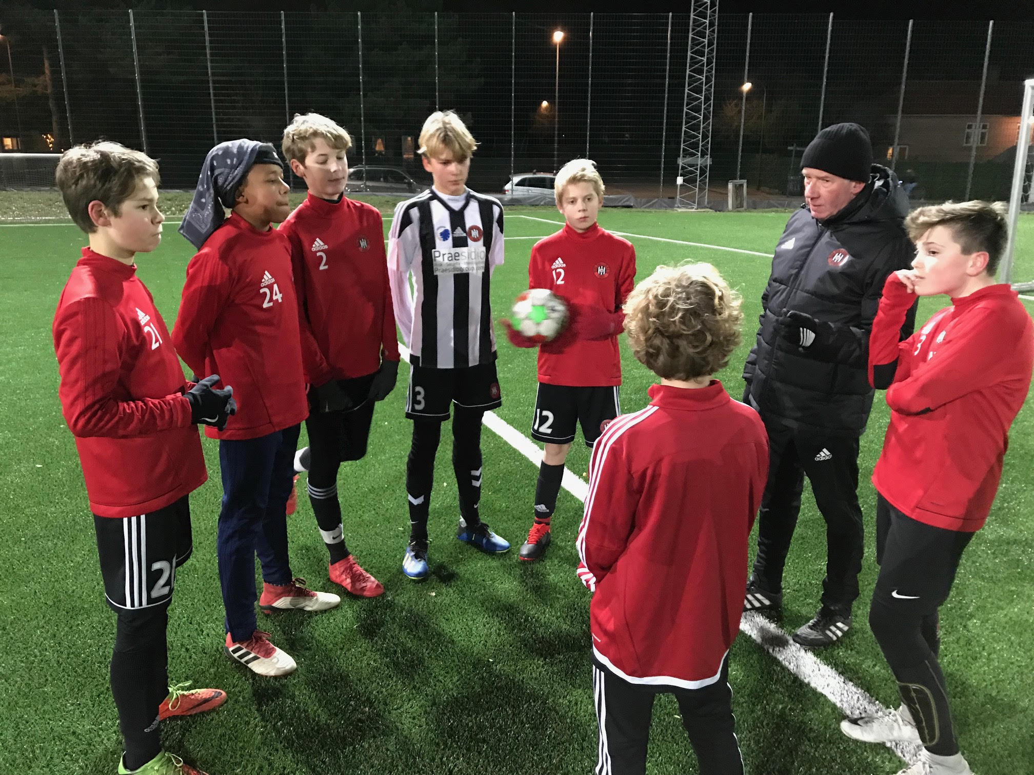(U14-2 drenge lytter opmærksomt efter træner Sørens forklaring af øvelsen)